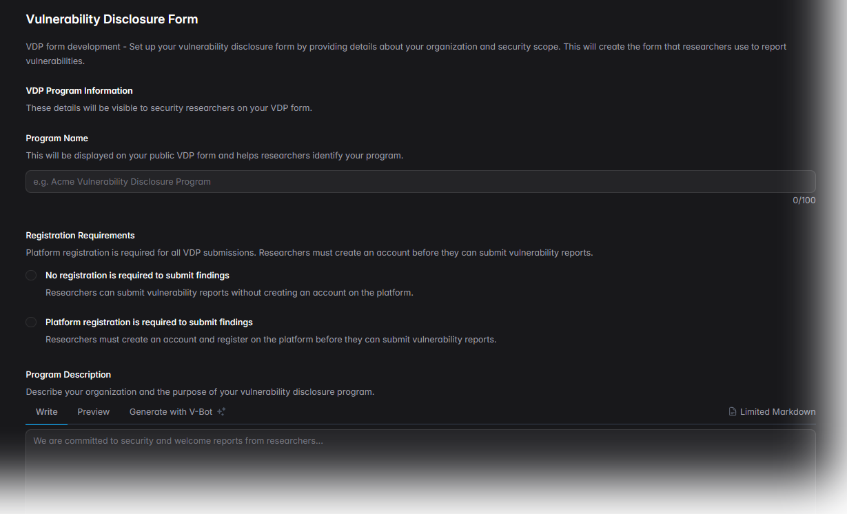 Our solution simplifies the entire process — from policy creation and submission handling to secure communication and vulnerability validation. Whether you're starting from scratch or enhancing an existing security initiative, V-Formation equips you with the tools, structure, and expertise needed to protect your digital assets and engage responsibly with the security research community.